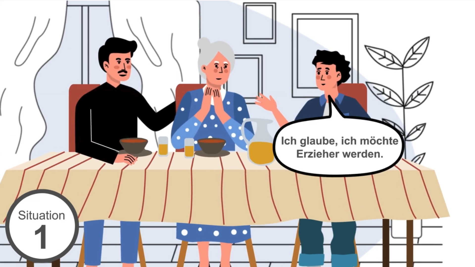 Vater, Großmutter und jugendlicher Sohn sitzen gemeinsam am Esstisch beim Mittagessen. Die Großmutter erzählt, dass ihr Vater damals schon als Arzt gearbeitet hat und daraus eine Familientradition geworden ist. Im Gespräch kommt die Frage auf, was ihr Enkel später einmal werden möchte. Darauf wird die erste Gesprächssituation gezeigt. Sohn: „Ich glaube, ich möchte Erzieher werden. Ich wollte ja schon immer was mit Menschen machen und ihnen helfen. Wir haben auch in Schule drüber gesprochen und mit der Ausbildung hat man wohl richtig viele Möglichkeiten.“ Großmutter: „Was? Du kannst doch kein Erzieher werden. Das ist was für Frauen. Was sollen denn die anderen Leute denken? So ein schlecht bezahlter Beruf. Du musst studieren. Du kannst doch nicht einfach so unsere Familientradition kaputt machen.“ Vater: „Also jetzt übertreibst du aber. Erzieher*in sein hat doch nichts mit Mann oder Frau zu tun und Geld ist auch nicht alles. Natürlich fände ich es auch gut, wenn du Arzt werden würdest, aber das Wichtigste ist doch, dass er einen Beruf macht, der ihm Spaß macht. Unsere Familie muss das akzeptieren und du auch.“