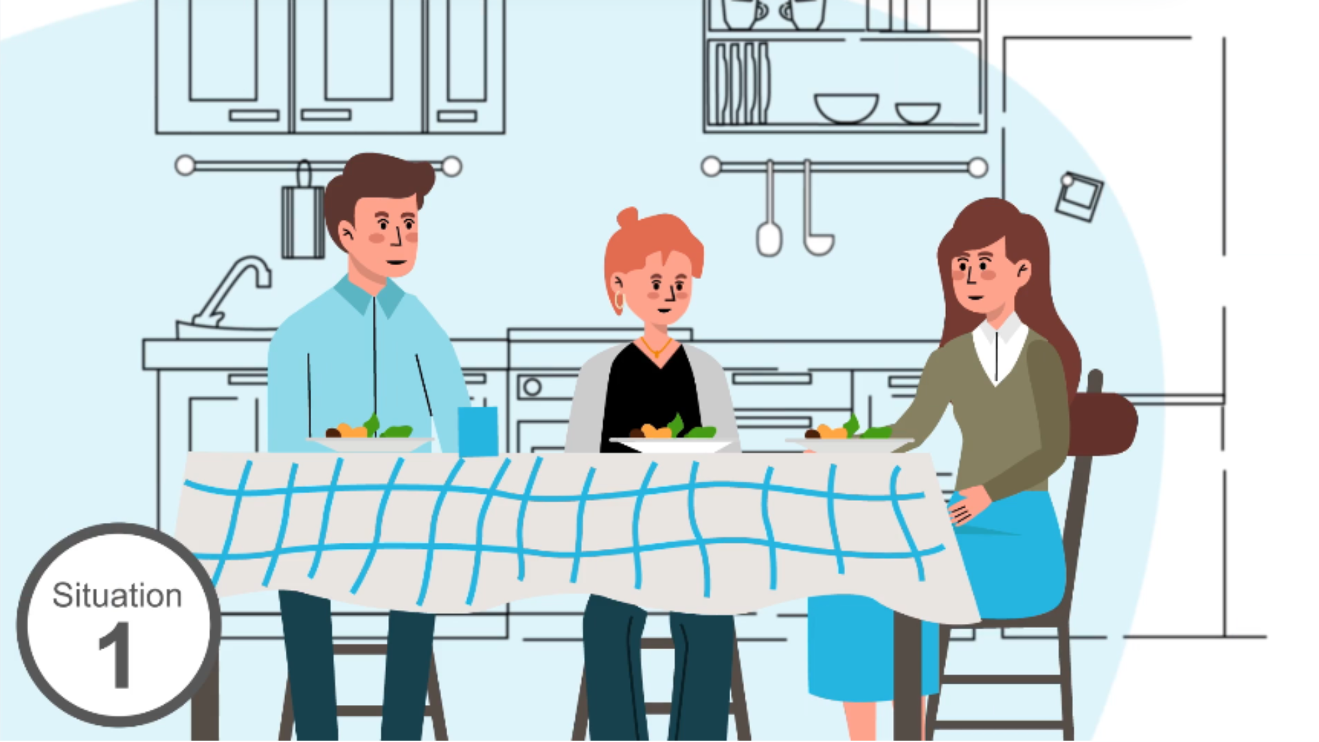 Mutter, Vater und jugendliche Tochter sitzen gemeinsam am Esstisch in der Küche. Beim Abendessen berichtet die Tochter von ihrem Schultag. Darauf wird die erste Gesprächssituation gezeigt. Tochter: „Wir haben heute über verschiedene Berufe geredet. Friseurin fand ich am besten. Ich hatte ja gar keine Ahnung, dass die auch Make-up machen. Und das kann ich ja schon. Dann könnte ich damit sogar Geld verdienen. Bei TikTok schaue ich das ja auch immer an. Ich könnte dann auch so Videos machen. Die haben super viele Views.“ Mutter: „Das ist doch komplett unrealistisch. Du bist naiv. Das schaffen doch nur ganz wenige. Und wie der Job wirklich ist, das weißt du doch auch nicht. So wie du es dir vorstellst, ist es sicher nicht.“ Tochter: „Aber so ist das doch gar nicht. Die zeigen ganz oft in den Videos, wie so ein Tag als Friseur ist. Und haben auch immer so coole Vorher -Nachher -Videos.“ Vater: „Na, wenn du meinst. Ich mische mich da nicht ein. Mach, was du denkst.“