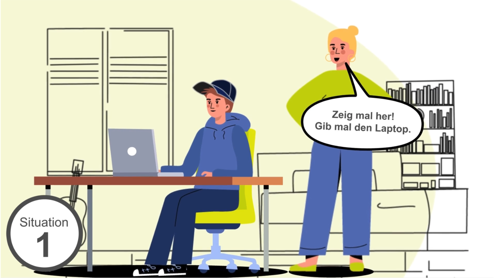 Mutter kommt in das Zimmer ihres Jugendlichen Sohnes. Dieser sitzt am Schreibtisch und arbeitet an seinem Bewerbungsschreiben. Interessiert fragt die Mutter nach, für welche Firma er sich bewirbt. Als sie sich die Bewerbung genauer anschaut, bemerkt sie ein paar kleine Fehlerchen. Darauf wird die erste Gesprächssituation gezeigt. Mutter: „Zeig mal her! Gib mal den Laptop! Ich mach das schnell für dich, damit du abschicken kannst. Ich druck es dann gleich auch noch aus und geb dir eine Mappe. Das darf auf keinen Fall verknicken.“ Sohn: „Danke, Mama.“ Mutter: „Ich ruf dann auch nochmal da an. Dann wissen die gleich Bescheid, dass du dich bewirbst.“